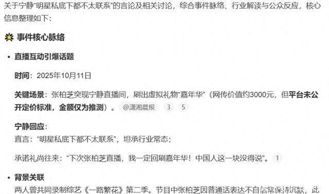 例如《花儿与少年2》结束后,仅杨洋会发新年祝福,其他成员基本无联系(当然,那时候这个节目也是闹得很不愉快,直接成为了花学长青树);与黄龄合作舞台四年未加微信,坦言“互不打扰是艺人常态”。 就在说这句话的时候张柏芝突然给她刷了一个抖音虚拟礼物嘉年华,按照抖音打赏的标准来看,就是3000元左右的金钱。 看到这个嘉年华宁静就直接闭嘴没有再说什么了,还说下场张柏芝直播的时候会回刷的,这就是礼尚往来。